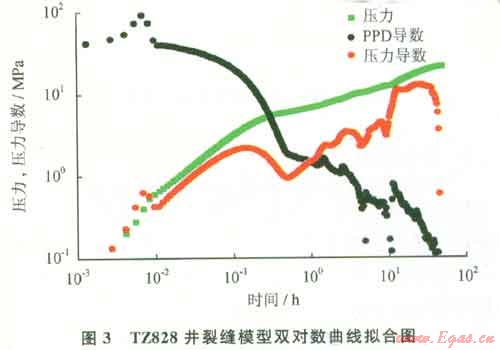 裂縫井模型也是塔中碳酸鹽巖儲(chǔ)層的主要類型之一,此類井由于基質(zhì)孔滲條件差,能量補(bǔ)給不足,相應(yīng)的產(chǎn)能低、遞減快。如TZ828井,5595~5603m儲(chǔ)層的沉積環(huán)境主要為粒屑灘、礁丘亞相,礁翼、中高能砂屑灘微相。巖性生屑砂屑灰?guī)r、層孔蟲骨架巖,含大量棘屑、發(fā)育溶洞、灰色生物礁灰?guī)r、見高角度構(gòu)造縫和蜂窩狀溶蝕孔洞??紫抖绕骄禐?.8%,儲(chǔ)層類型以Ⅰ、Ⅱ類為主。試油期間開井流動(dòng)曲線近似一條直線,開井期間地面無產(chǎn)出,表明地層無自噴能力;關(guān)井壓力曲線恢復(fù)緩慢,反映儲(chǔ)層為低滲透儲(chǔ)層。二次關(guān)井導(dǎo)數(shù)曲線后期出現(xiàn)不規(guī)則,是由于井筒相變的影響造成的,如圖3所示,試井解釋只能用10h以內(nèi)的數(shù)據(jù)。