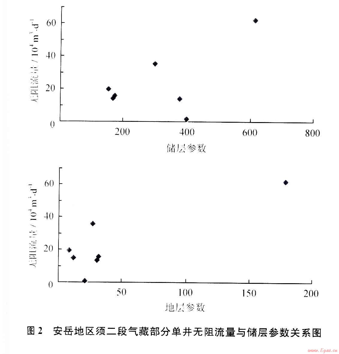 對儲層基礎參數(shù)較全的7口井,統(tǒng)計了安岳須二段氣藏(上亞段)計算的無阻流量與儲層參數(shù)相關性分析(圖2),儲層參數(shù)、地層系數(shù),無阻流量與它們間具有一定的正向相關件性不大.