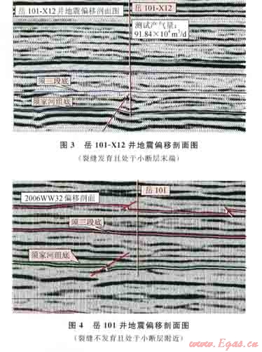 該區(qū)由于斷層規(guī)模較小,在二維地震解釋的須家河組底構造圖中,部分小斷層未解釋,但在偏移剖面中可識別出。處于裂縫的可能發(fā)育區(qū),加砂壓裂后,也能獲得高產(chǎn)。比如岳l01、岳111井,可能是與小斷層附近發(fā)育的裂縫有了溝通,氣井獲得了高產(chǎn)氣流(圖4)。