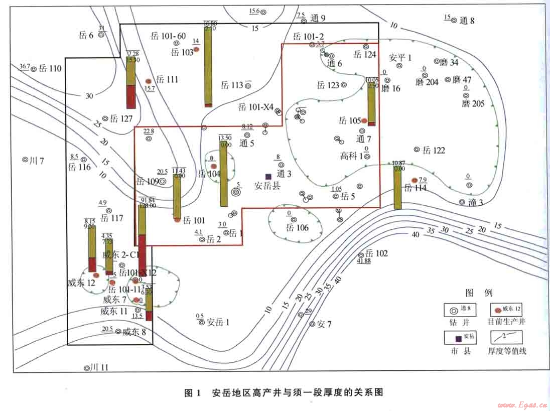 對安岳地區(qū)測試完成井統(tǒng)計表明:中、高產(chǎn)井中共有10口,其中有5口位于雷口坡組殘丘發(fā)育區(qū)(岳101-Xl2、岳l05井、威東l2、威東7、岳l04側),有3口井位于雷口坡組相對高帶、須一段缺失區(qū)邊緣(岳101-11、岳l01、岳ll4),即雷口坡組殘丘發(fā)育區(qū)及其附近集中了目前所獲氣產(chǎn)量80%的中、高產(chǎn)井。