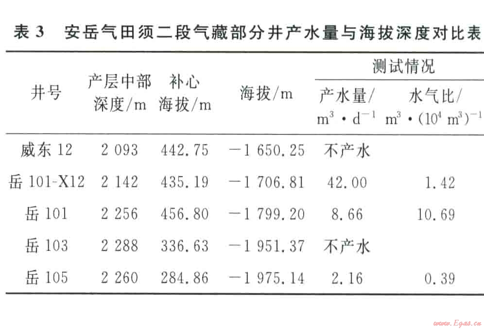 從生產(chǎn)井產(chǎn)水情況與海拔深度對比分析認為(表3):海拔高的井如岳l01-Xl2井高產(chǎn)水,而海拔低的井如岳l03井不產(chǎn)水,目前生產(chǎn)井氣水關系與海拔深度沒有明顯關系,產(chǎn)水大小不受構造控制。