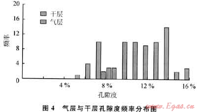 有效孔隙度下限確定有兩種方法:①根據(jù)壓汞資料,分析中值壓力與孔隙度的關(guān)系,當(dāng)孔隙度小于某一值時(shí),中值壓力迅速增大,說明當(dāng)孔隙度小于該值時(shí),汞基本壓不進(jìn),即這部分孔隙基本為無效孔隙[6~7](圖3),利用該法確定的研究區(qū)有效孔隙度下限為7%;②統(tǒng)計(jì)試油產(chǎn)層段與干層段孔隙度的分布特征來確定(圖4)。由圖3可知,干層和氣層孔隙度的分界線在7%左右,可見該區(qū)儲層有效孔隙度取7%比較合適。