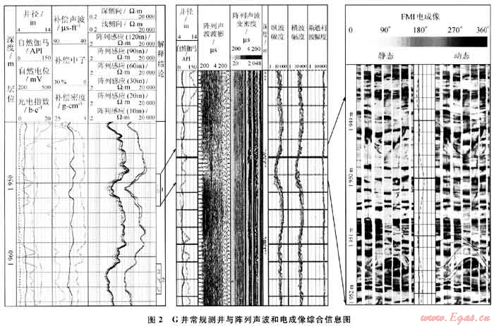 低孔裂縫型儲層:利用常規(guī)測井資料難以識別,需根據(jù)成像測井圖上的裂縫響應(yīng),陣列聲波變密度干擾圖形、波形幅度降低及陣列聲波縱波、橫波和斯通利波能量衰減,斯通利波計(jì)算的滲透率大等特征識別。如川東地區(qū)G井須家河組1948.8~1953.2m井段,用常規(guī)測井資料識別難度較大,但陣列聲波變密度干擾明顯、波形幅度降低及陣列聲波縱波、橫波和斯通利波能量有明顯衰減,電成像圖上有明顯裂縫顯示,可清楚說明該段裂縫較發(fā)育,為低孔一裂縫型儲層,中途測試產(chǎn)天然氣1.42×104m3/d。其測井特征詳見圖2。