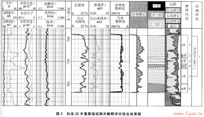 白淺25井蓬萊鎮(zhèn)組井段746~754m,綜合分析該段為較純的細(xì)-中粒砂巖儲層,長石含量較高,粒度較細(xì),導(dǎo)致自然伽馬值極高(圖5),巖心分析孔隙度高達(dá)19.97%,平均值為16.72%。測井綜合分析處理后解釋了Ⅰ類、Ⅱ類和Ⅲ類氣層各2個(gè)(圖5)。738.4~756.5m井段測試產(chǎn)1.659×104m3/d工業(yè)氣流。