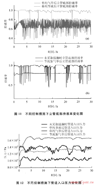 圖11為不同控制措施下立管底部持液率的變化圖。由圖11可知:節(jié)流加氣舉時(shí)段塞流得到了很好的抑制;單純節(jié)流時(shí)立管底部持液率波動(dòng)幅度和頻率都較小;而單純注氣后立管底部持液率波動(dòng)較為頻繁,但波動(dòng)區(qū)間較??;不采取控制措施時(shí)立管底部持液率的波動(dòng)區(qū)間最大;節(jié)流加氣舉時(shí)立管底部的壓力也是非常穩(wěn)定的。從模擬結(jié)果看,節(jié)流加氣舉法的段塞流控制效果是很好的。