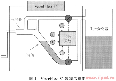 2004年Kovalev又提出了Vessel-lessS3[4]們的方法,其流程示意圖如圖2所示,通過(guò)1個(gè)體積更小的管道來(lái)替代原來(lái)的小型預(yù)分離器,流體在管道里完成了分層,液體下傾,氣體上升。