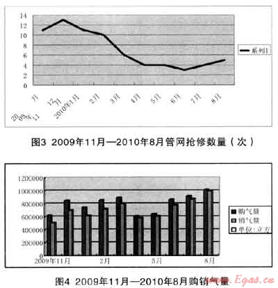 我公司2010年2月使用加濕技術(shù)時(shí)擁有干管鑄鐵閥門約61座,鑄鐵管網(wǎng)總長度84.8km,調(diào)壓站(箱)15個(gè);日供氣能力約2.3萬m3。下面的一組圖表反映的是我公司2009-2010年加濕前后管網(wǎng)搶修及各月燃?xì)赓?、銷氣量及氣損統(tǒng)計(jì)情況: