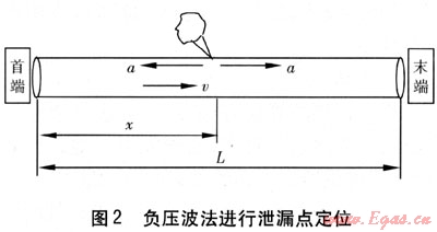 負壓波法進行泄漏點定位見圖2。負壓波從泄漏點到達管道首、末端的時間分別為t1、t2。令△t=t1-t2,則存在如下關系: