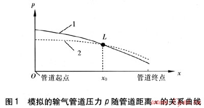 根據(jù)式(1)建立管道模型,利用SCADA系統(tǒng)同一時刻對管道兩端實時采集到的數(shù)據(jù),分別進行兩組管道數(shù)據(jù)的仿真:由起點到終點的模型仿真和由終點到起點的模型仿真。如果管道運行正常,則以上兩組仿真數(shù)據(jù)與實測數(shù)據(jù)偏差較小(允許相對誤差為5%[4])。但當管道發(fā)生泄漏后,仿真數(shù)據(jù)將不能與實測數(shù)據(jù)中的1個或幾個吻合,由此可以判定管道發(fā)生了泄漏。當天然氣在管道泄漏點處有相同的邊界條件時,由流體的連續(xù)性可知,泄漏點處的壓力和溫度也相同。因此當管道泄漏時,根據(jù)管道起點邊界條件繪制的壓力曲線1和根據(jù)終點邊界條件繪制的壓力曲線2將相交于L點,見圖1,此時可判定L點對應的管道位置x0就是泄漏點位置。泄漏量為起點到終點模型仿真在泄漏點處的流量與終點到起點模型仿真在泄漏點處的流量之差。