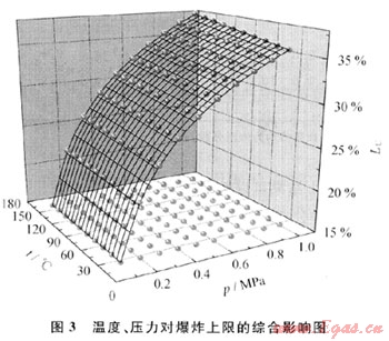 圖3給出了溫度和壓力對(duì)爆炸上限的綜合影響??梢钥闯鲭S著溫度、壓力的提高,爆炸極限范圍增大。在同一溫度下,壓力由0.1MPa升高到1.0MPa,其爆炸極限由15.14%擴(kuò)大到35.74%。在同一壓力下,溫度由25℃升高到160℃,低壓時(shí),爆炸上限幾乎沒有變化;在高壓時(shí),爆炸上限由34.79%上升至35.74%。可見壓力對(duì)爆炸上限的影響甚于溫度對(duì)其的影響。因此,在煤層氣的工業(yè)生產(chǎn)中,應(yīng)盡可能在低壓下操作。