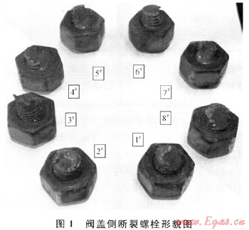 閥蓋上的8個(gè)螺栓光孔均發(fā)生了月牙形磨損或擠壓變形成為橢圓形,其中橢圓長軸沿徑中心。對光孔長軸和短軸進(jìn)行測量并計(jì)算橢圓度,發(fā)現(xiàn)1#、2#、3#、8#光孔比4#、5#、6#、7#光孔橢圓度大(光孔編號(hào)與螺栓編號(hào)一一對應(yīng))。