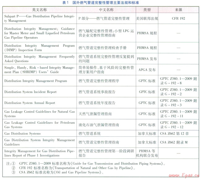 燃?xì)夤艿劳暾怨芾矸ㄒ?guī)和標(biāo)準(zhǔn)是實(shí)施管道完整性管理的重要指導(dǎo)性文件。為了有效推進(jìn)燃?xì)夤艿劳暾怨芾砉ぷ?,美?guó)、加拿大等國(guó)家燃?xì)夤芾砗脱芯繖C(jī)構(gòu)制定了相關(guān)的法規(guī)和標(biāo)準(zhǔn),主要的法規(guī)和標(biāo)準(zhǔn)見(jiàn)表l。表l中APGA是美國(guó)公共燃?xì)鈪f(xié)會(huì)的簡(jiǎn)稱,GPTC是美國(guó)燃?xì)鈪f(xié)會(huì)(簡(jiǎn)稱AGA)的下屬機(jī)構(gòu)燃?xì)夤艿兰夹g(shù)委員會(huì)的簡(jiǎn)稱。