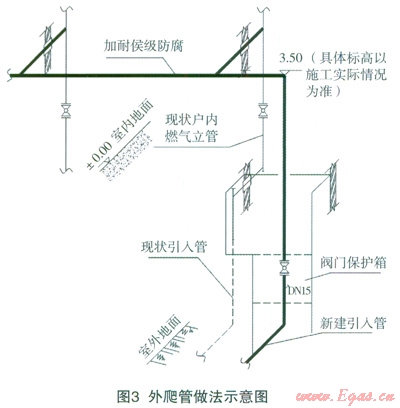 針對老舊小區(qū),戶內(nèi)立管往往位于居民室內(nèi)裝修或者包封內(nèi),改造難度較大或者不存在改造的可能性,可采用將引入管改至與首層立管相接處的方式,而不改造原有燃?xì)饬⒐?。如果存在地上引入口被占壓的情況,而且占壓物不便于拆除時,可采用樓前管采用外爬墻方式敷設(shè),外爬管在樓房燃?xì)饬⒐芩趥?cè)爬至二層樓的0.5m高處,分別與現(xiàn)狀燃?xì)饬⒐芟嘟樱鐖D3所示。