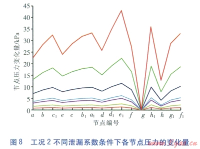 對圖4中的數(shù)據(jù)進行處理求得工況l不同泄漏系數(shù)條件下各節(jié)點壓力相對于正常工況壓力的變化量,即正常工況時節(jié)點的壓力減去泄漏工況時節(jié)點的壓力,見圖6。