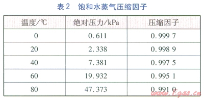 我公司橋東煤氣儲配站的人工煤氣來自邢臺旭陽焦化有限公司,經(jīng)過脫萘、脫硫凈化處理后,主要組成見表l。經(jīng)站區(qū)流量計計量,進入管網(wǎng),輸送至用戶,日均供氣量為17×104m3d左右,用氣高峰期可達24×104m3d。主干管采用DN 600mm的螺旋焊縫鋼管,長度約l0km,管網(wǎng)運行壓力為3070kPa。在計量處測人工煤氣溫度,經(jīng)統(tǒng)計,濕煤氣的溫度不超過50℃,處于水飽和狀態(tài)。表2080℃的飽和水蒸氣壓縮因子值[1]。由表2可知,當(dāng)溫度不超過80℃,水蒸氣的飽和蒸氣壓很低,飽和水蒸氣壓縮因子與l的偏差小于1%,趨于理想氣體性質(zhì)。