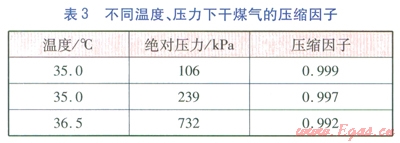 理想氣體的壓縮因子值等于l,實際氣體壓縮因子值趨于1時,性質(zhì)趨于理想氣體[1]。表3是某公司人工煤氣的壓縮因子值[1],我公司人工煤氣的組成與該公司人工煤氣組成差別不大,可參考表3,其壓縮因子值與理想氣體壓縮因子偏差小于1%。因此,在732kPa以下,干煤氣可看成是理想氣體。
