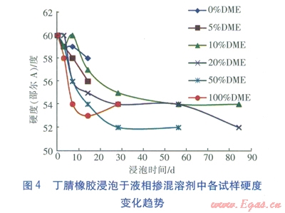 ③丁腈橡膠是一種合成橡膠,屬交聯(lián)聚合物,它在二甲醚摻混液中的溶脹都屬于有限溶脹。液相摻混液對丁腈橡膠的腐蝕,主要發(fā)生在浸泡的前10d左右的時(shí)間里,之后溶脹現(xiàn)象都趨于平穩(wěn)。