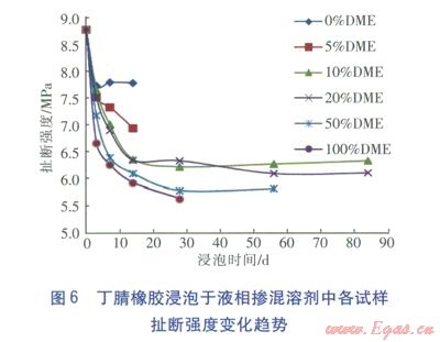 DMELPG的液相對丁腈橡膠不同性能的影響不同。其中摻混液對丁腈橡膠的體積變化率影響最大,質(zhì)量變化率影響次之。對丁腈橡膠的壓縮永久變形量有一定影響,對扯斷伸長率及硬度等力學(xué)性能的影響較小。