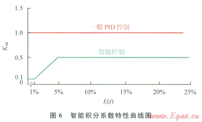 可見,采用智能控制,可使偏差快速穩(wěn)定收斂,當(dāng)[å|e(t)|/n]/Yset≥5%時(shí),采用固定比例控制,當(dāng)[å|e(t)|/n]/Yset≤5%時(shí),采用一定時(shí)間(大約0.5個(gè)波動(dòng)周期)相對(duì)偏差絕對(duì)值的均值(10/Yset)[ å|e(t)|/n]作為改變控制量的隨機(jī)變動(dòng)系數(shù),智能系數(shù)Kint,與E(t)在5%以下時(shí)呈線性遞增關(guān)系,控制量u(t)與E(t)呈非線性遞增關(guān)系。