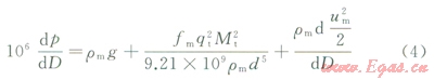 式中P為井筒中任意點(diǎn)的壓力,MPa;D為井深,m;rm為氣液混合物的密度,kg/m3;um為氣液混合物的流速,m/s;g為重力加速度,m/s2;fm為兩相摩阻系數(shù);d為油管內(nèi)徑,m;qt為地面產(chǎn)液量,m3/d;Mt為地面標(biāo)況下,每生產(chǎn)1m3液體伴生油、氣、水的總質(zhì)量,kg/m3;H1為持液率;r1為液體密度,kg/m3;go、gg、gw分別為油、氣、水的相對(duì)密度;Rs為天然氣的溶解氣油比;Bo、Bw分別為油、水的體積系數(shù);WOR為生產(chǎn)水油比;rw、rg分別為水、氣的密度,kf/m3;¦w、¦o分別為所產(chǎn)液體中的含水率、含油率;GLR為氣液比。