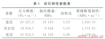 A井垂深2380m,水平井段長l828m,目標頁巖層在2370~2397m,層厚27m,基質(zhì)滲透率為0.002mD,各層巖石物性參數(shù)如表1所示;本井共進表1巖石物性參數(shù)表行了七級清水壓裂,每一級有5簇射孔段,每一簇含8個射孔孔眼;選擇100目石英砂作為支撐劑,假設(shè)支撐劑在所有裂縫中均勻分布,沉降速率為1.27mm/min。兩個模型均假設(shè)縫網(wǎng)由兩簇分別垂直于最大、最小水平主應(yīng)力的垂直縫組成,不含水平縫。