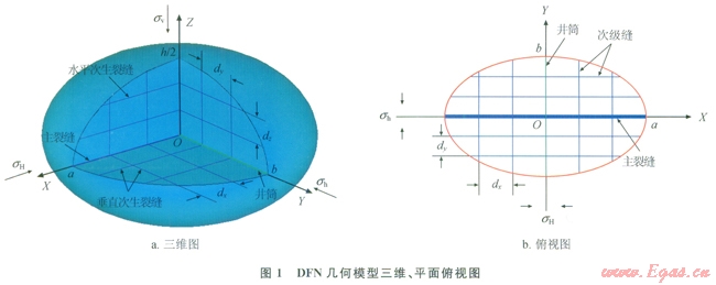 DFN模型基本假設(shè)如下:①壓裂改造體積為2a×2b×h的橢球體,由直角坐標系XYZ表征,X軸平行于最大水平主應(yīng)力(sH)方向,Y軸平行于最小水平主應(yīng)力(sh)方向,Z軸平行于垂向應(yīng)力(sv)方向;②包含一條主裂縫及多條次生裂縫,主裂縫垂直于sh方向,在X-Z平面內(nèi)擴展,次生裂縫分別垂直于X、Y、Z軸,縫間距分別為dx、dy、dz;③考慮縫間十?dāng)_及壓裂液濾失;④地層及流體不可壓縮?;谝陨霞僭O(shè),作出DFN模型幾何模型的示意圖(圖1)。
