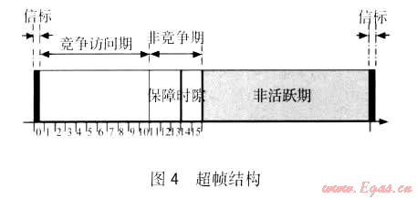 在IEEE802.15.4 MAC協(xié)議定義了超幀結構,如圖4所示。在幀群中存在兩個部分:活躍期與不活躍期(休眠期),在活躍期開放信道接入,休眠期關閉信道,進入休眠狀態(tài)以減少能耗。