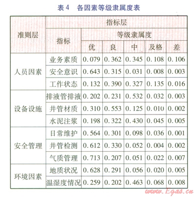 本研究中,研究人員對CNG地下儲氣井的安全評價除了一般性的理論分析外,還建立了指導(dǎo)地下儲氣井安全評價的模糊層次分析模型。該模型的優(yōu)點(diǎn)是:用層次分析法建立各種安全因素指標(biāo)集,避免了確定權(quán)重時的主觀片面性;綜合模糊數(shù)學(xué)理論與層次分析法,將定性分析與定量分析相結(jié)合,使主觀估計(jì)客觀化,尋求到了理論分析與工程實(shí)際的結(jié)合點(diǎn);采用比較成熟的模糊層次分析法進(jìn)行評價,較好地解決了工程項(xiàng)目中模糊因素的度量[9]。