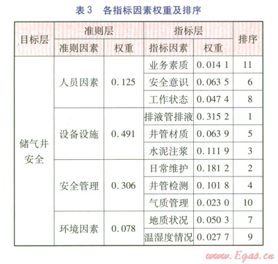 匯總各準(zhǔn)則層因素與指標(biāo)層因素對于儲氣井安全目標(biāo)的權(quán)重,即可以排出各指標(biāo)因素對儲氣井安全權(quán)重的順序。以某CNG地下儲氣井為例,利用層次分析法,把相關(guān)各指標(biāo)因素進(jìn)行綜合評定,并且進(jìn)行歸一化處理,見表3。