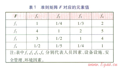 此處利用方根法計(jì)算,用兩兩比較求出各元素的相對重要程度,其準(zhǔn)則矩陣F對應(yīng)的元素值見表1。