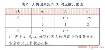 利用方根法計(jì)算,可以得出指標(biāo)層對準(zhǔn)則層各因素的權(quán)重,人員因素矩陣D1對應(yīng)的元素值見表2。