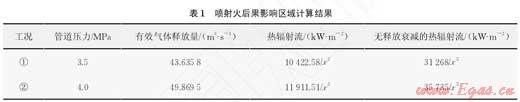 選取兩種泄漏工況:①輸氣壓力3.5MPa,15cm孔洞,裂口面積約0.018cm2;②輸氣壓力4.0MPa,15cm孔洞,裂口面積約0.018cm2。燃燒率參數(shù)取0.3,發(fā)射率參數(shù)取0.2,燃燒熱取50000,設(shè)影響位置與著火點(diǎn)的距離為x,分別計(jì)算兩種工況下噴射火后果影響區(qū)域(表1)。