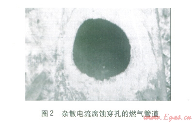 雜散電流腐蝕穿孔速度快,影響范圍廣,且隨機(jī)性強(qiáng)。雜散電流腐蝕創(chuàng)面光滑,邊緣較整齊,產(chǎn)生黑色腐蝕產(chǎn)物。修復(fù)方式同細(xì)菌腐蝕,但應(yīng)注意多數(shù)雜散電流腐蝕并不單一出現(xiàn)。圖2為某搶修現(xiàn)場(chǎng)雜散電流腐蝕穿孔的燃?xì)夤艿馈?span lang="EN-US">