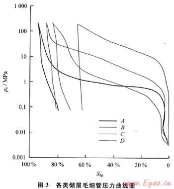 Ⅳ型:孔隙類型為粒內(nèi)溶孔以及裂縫組合,巖石類型主要為晶粒灰?guī)r、白云質(zhì)灰?guī)r和泥微晶灰?guī)r,毛細(xì)管壓力曲線為單峰細(xì)歪度,也呈明顯向左微凹的平臺(tái)狀(圖3中D曲線)。排驅(qū)壓力大于5.0MPa,中值壓力大于10.0MPa,孔隙度小于3%,滲透率小于0.01mD,為該區(qū)極差或無儲(chǔ)集能力的孔隙結(jié)構(gòu)類型。
