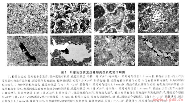 不同沉積微相和巖石類型的樣品物性分析資料,表明川東黃龍組碳酸鹽巖儲(chǔ)層中以粒屑灘相的顆粒白云巖、晶粒白云巖及白云質(zhì)巖溶角礫巖的物性為最好,以發(fā)育孔洞縫型和孔隙型儲(chǔ)層為主,而薩勃哈相的次生晶?;?guī)r、泥-微晶白云巖和開闊-局限海灣潮下相的泥-微晶灰?guī)r及膠結(jié)作用較強(qiáng)的巖溶角礫巖普遍很致密,僅局部發(fā)育有裂縫型儲(chǔ)層。