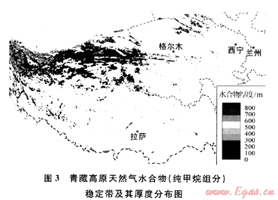 進一步地,筆者分別利用祁連山木里地區(qū)33號鉆孔冷泉氣(CH4:96.6%,C2H6:3.3%,C3H8:0.1%,均為摩爾分數(shù),下同)、風(fēng)火山-鳥麗地區(qū)頂空氣平均值(CH4:93.8%,C2H6:6.2%)和羌塘盆地雙湖地區(qū)頂空氣平均值(CH4:63.3%,C2H6:24.3%,C3H8:8.9%,nC4H103.5%)等實測氣體組分,結(jié)合青藏高原的其他參數(shù),對青藏高原天然氣水合物的穩(wěn)定帶及其厚度進行了計算,結(jié)果顯示青藏高原具備較好的天然氣水合物形成條件,即使要求最為苛刻的純甲烷水合物也能在局部地區(qū)形成(圖3),且隨著重?zé)N組分的逐漸增加,能形成水合物的地區(qū)范圍逐漸增大,水合物穩(wěn)定帶厚度也逐漸增厚。