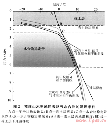 天然氣水合物形成于低溫高壓環(huán)境下,并需要有接近于飽和的氣源條件和充足的水源條件,同時氣體組成及其孔隙水鹽度也將影響到水合物能否形成并保持穩(wěn)定。由于中國凍土區(qū)的水源條件比較豐富,故制約水合物能否形成的關(guān)鍵因素是氣源條件和溫壓條件,這里先就溫壓條件進行深入分析。