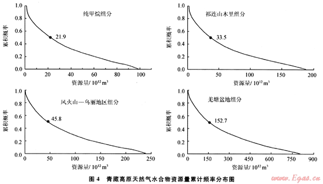 運用體積法估算天然氣水合物資源量時,由于上述5個參數(shù)特別是沉積物孔隙度(φ)和水合物飽和度(H)的取值范圍變化較大,從而影響了計算結(jié)果的可信度。因此,利用蒙特卡羅法對青藏高原的資源量再次進行了估算。蒙特卡羅法是利用各種隨機變量的抽樣序列模擬給定概率的統(tǒng)計模型,得出數(shù)值解的近似統(tǒng)計值。體積法計算天然氣水合物資源量的5個參數(shù)中除分布面積(A)外,其他4個參數(shù)都是獨立的隨機變量,針對任一隨機變量蒙特卡羅法均可根據(jù)大量的實測數(shù)據(jù)(或理論假設(shè)數(shù)據(jù)),計算出相應(yīng)的頻率曲線,再根據(jù)頻率曲線給出一定頻率下的樣本值。然后根據(jù)一定概率下(例如0.5)各參數(shù)的樣本值計算出這一概率下的天然氣水合物資源量。蒙特卡羅法的估算結(jié)果顯示,在0.5概率下青藏高原純甲烷組分、祁連山木里組分、風(fēng)火山-烏麗地區(qū)組分和羌塘盆地組分天然氣水合物的資源量分別為21.9×1012m3、33.5×1012m3、45.8×1012m3和153×1012m3(圖4),均比體積法估算的相應(yīng)資源量要大。