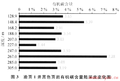 室內(nèi)實(shí)驗(yàn)研究的結(jié)果表明,龍馬溪組黑色頁巖中所含的有機(jī)質(zhì)類型主要為腐泥型和偏腐殖混合型,有機(jī)質(zhì)成熟度(Ro)介于1.62%~2.26%之間,平均為2.04%,有利于天然氣的生成(現(xiàn)今主要為殘留熱解氣及生物再作用氣)。結(jié)合頁巖含氣量檢測結(jié)果,對渝頁1井部分巖心進(jìn)行了有機(jī)碳含量測試。燃燒法測定結(jié)果表明,深度128.9~305m之間10個樣品的有機(jī)碳含量值變化于1.44%~7.28%,一般達(dá)到3.0%左右,平均為3.7%(圖3)。由于有機(jī)質(zhì)是天然氣生成與吸附的主體,故有機(jī)碳含量的大小幾乎決定了頁巖中的天然氣含量,即有機(jī)碳含量與頁巖氣含量呈正比。