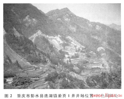 渝頁1井位于七曜山東部,該處沿北北東走向的群山連綿起伏,形成了與地質(zhì)構(gòu)造特點(diǎn)大體一致的地理景觀。由于構(gòu)造斷裂、剝蝕風(fēng)化及徑流沖刷等地質(zhì)作用,背斜核部常表現(xiàn)為溝、槽、谷等地形特征,與向斜核部在地表上的峰、嶺、脊等地形特征形成明顯對比。由于北東-南西和北西-南東方向的兩組斷裂在該地區(qū)同時發(fā)育,故地質(zhì)、地貌特征變化復(fù)雜。渝頁1井位于重慶市彭水縣連湖鎮(zhèn)北西西290°方位2~3km的曹家溝,屬連湖鎮(zhèn)樂地壩村所轄。區(qū)內(nèi)地形為北西高南東低,溝壑縱橫,相對高差1000m左右,其中渝頁1井位于山間河流切割沖刷所形成的“V”字形溝槽中(圖2)。