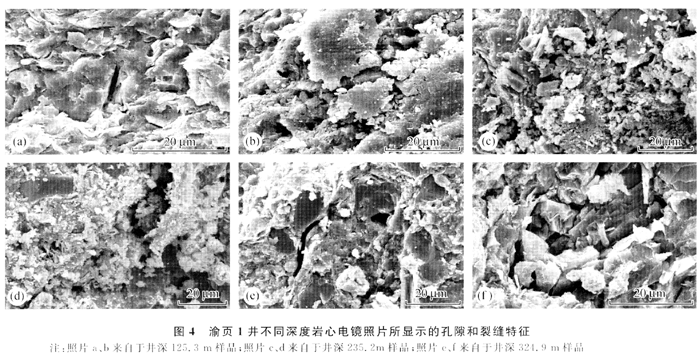 渝頁1井龍馬溪組黑色頁巖宏觀及微觀裂縫發(fā)育,宏觀裂縫可分為高角度、近水平及雜亂狀3類,可表現(xiàn)為充填、半充填或無充填。一般裂縫多呈高角度延伸,巖心中可見的單一裂縫長度為1.6m。觀察結(jié)果表明,各類裂縫多表現(xiàn)為不均一的集中分布特點(diǎn),充填與不充填裂縫常有繼承性發(fā)育特點(diǎn)。巖心樣品電鏡掃描特征顯示,黑色頁巖微孔隙和裂縫發(fā)育,孔隙直徑一般為1~5μm,少數(shù)介于1~8μm,微裂縫規(guī)模在10~25μm(圖4)。泥頁巖儲層儲集空間包括了黏土礦物粒間微孔隙(圖中b和d)、頁理間孔隙(圖中b)、溶蝕孔隙(圖中c和d)、成巖微裂縫(圖中f)及構(gòu)造裂縫(圖中a和e)等。