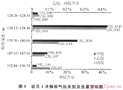 渝頁1井提撈的黑色巖心均為不含地層水的“干層”,即不含地層水(包括束縛水)的含氣層,若將隨機(jī)選取的巖心置于水中,則均將發(fā)生針尖狀氣泡不斷溢出的現(xiàn)象,視為頁巖氣的最直接證據(jù);此外,在鉆進(jìn)過程中,還多次在井筒中發(fā)現(xiàn)了氣泡溢出以及井口空氣中甲烷含量異常等現(xiàn)象,證實(shí)了頁巖中天然氣的直接存在。同時,渝頁1井的16塊樣品現(xiàn)場解析表明,位于281.Om和287.5m井深處樣品的含氣量現(xiàn)場解析值最高,計(jì)算現(xiàn)場解析氣量達(dá)到并超過0.1m3/t(解析持續(xù)時間為6h)??紤]到井筒提心時間較長(4.2h)、損失氣量及殘留氣量較多等原因,再結(jié)合已有解析曲線的比較研究,推測頁巖吸附含氣量大于1.0m3/t。結(jié)合頁巖總含氣量分析原理,初步計(jì)算頁巖總含氣量(吸附氣+游離氣)介于1.0~3.Om3/t之間,視為具有工業(yè)價(jià)值的頁巖氣。進(jìn)一步的色譜分析結(jié)果表明,天然氣樣品中同時含有甲烷和乙烷,在128.23~138.46m和206.75~209.18m井深等樣品中還發(fā)現(xiàn)了丙烷的存在(圖5)。其中,138.13~138.46m井深樣品中的甲烷、乙烷和丙烷含量分別為42.43%、0.42%、0.01%,其余為N2、CO2和O2等大氣成分。解吸樣品中烴類氣體含量的百分比并不高,可能主要反映為解析儀中空氣樣品的殘留或地下風(fēng)化帶中少量空氣成分的進(jìn)入。