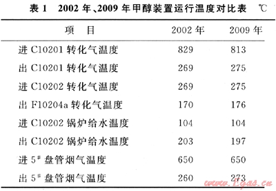 2002年(蒸汽系統(tǒng)能自平衡)、2009年(進(jìn)轉(zhuǎn)化爐對(duì)流段5#盤管煙氣溫度650℃)甲醇裝置運(yùn)行參數(shù)如表1所示。
