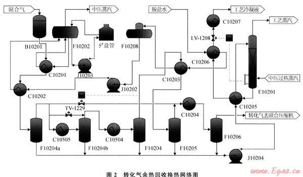 圖2為川西北氣礦甲醇廠轉(zhuǎn)化氣余熱回收換熱網(wǎng)絡(luò)。