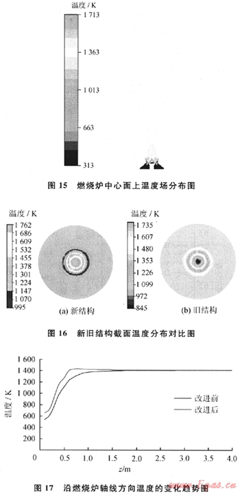圖15為爐內(nèi)主射流溫升速度示意圖,圖16為新舊結(jié)構(gòu)截面溫度分布對(duì)比圖,圖中顯示新結(jié)構(gòu)爐內(nèi)溫度分布非常均勻,基本維持在1400K,與原結(jié)構(gòu)下的溫度場相比,射流外圍邊界上因?yàn)橥猸h(huán)入口酸氣的通入溫度有所降低。但此區(qū)域內(nèi)氣體受回流區(qū)及氣體對(duì)流傳熱影響,溫度在很短距離內(nèi)即可達(dá)到爐內(nèi)平均溫度。圖17為沿燃燒爐軸線方向溫度的變化趨勢圖。由圖17可以看出,新結(jié)構(gòu)下射流中心區(qū)域溫升明顯加快,在很短的距離內(nèi)即可達(dá)到1400K。