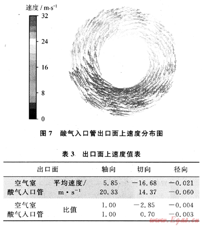 空氣室及酸氣入口管內(nèi)流場如圖4、5所示。圖6、圖7為空氣室及酸氣入口管出口面上的速度分布圖。表3所示為現(xiàn)役旋流裝置下空氣室和酸氣入口管出口面上的速度分量。流場計(jì)算完成后,將空氣室和酸氣入口管出口面上的速度參數(shù)作為燃燒爐爐體的空氣與酸氣入口條件對(duì)爐內(nèi)燃燒場進(jìn)行數(shù)值模擬。