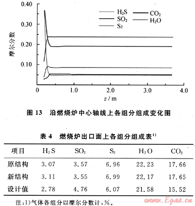圖13為沿燃燒爐軸線方向各組分組成變化圖。由硫生成曲線來看,單質(zhì)硫在燃燒器內(nèi)增量最快,之后呈非常緩慢的增長趨勢。表4為改進(jìn)前后燃燒爐出口面上各組分的組成表,由表4可知,出口處各組分含量與燃燒爐實(shí)際運(yùn)行值較為吻合,而與原結(jié)構(gòu)相比,新結(jié)構(gòu)出口面上S2的摩爾分?jǐn)?shù)提高了0.03%,說明采用外環(huán)酸氣入口提高了爐內(nèi)氣體混合效果并進(jìn)而提高了燃燒爐的總硫轉(zhuǎn)化率。