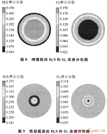 圖8、9分別為假定爐內(nèi)沒有反應(yīng)發(fā)生時(shí)噴嘴前端(燃燒器直徑最小處)及燃燒器斜錐段xy截面上的組分分布圖。