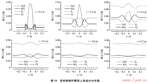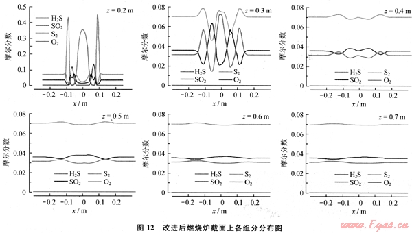 圖12為各組分在噴嘴前端沿xy截面中心軸線上的分布情況。對(duì)比圖10可知,H2S由原來的單駝峰式分布變?yōu)槎喾迨椒植?。通過外環(huán)酸氣分流,提高了射流外圍處H2S的含量,外環(huán)酸氣直接通入到原S02濃度最大處,使此處的單質(zhì)硫生成量增多。由各組分濃度變化來看,H2S和S02的二次混合過程由原來主射流旋流擴(kuò)散混合轉(zhuǎn)變?yōu)橹苯釉谏淞魍鈬吔鐚犹幓旌稀S蓤D12可知,爐內(nèi)組分在z為0.6m處即可基本達(dá)到平衡,說明采用外環(huán)酸氣入口將H2S直接通入S02濃度最大處,提高了H2S與S02的混合效果。