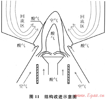 主射流呈一種空氣包絡(luò)酸氣的分布形態(tài),此分布將導(dǎo)致O2消耗完畢后,射流中心區(qū)域內(nèi)H2S過量,射流外圍處S02過量。H2S與S02的混合將主要取決于主射流內(nèi)外氣體的不斷擴(kuò)散完成,此混合過程相對(duì)較慢,對(duì)單質(zhì)硫的生成來講是不利的。為此,筆者提出了增設(shè)外環(huán)酸氣入口的結(jié)構(gòu)改進(jìn)措施(圖11),外環(huán)酸氣入口貼近空氣室外壁面,入口方向與預(yù)混合段平行。通過此方法進(jìn)行改進(jìn),可對(duì)射流中心處過量的H2S分流,并將其直接通入到射流外圍的S02濃度最大處。